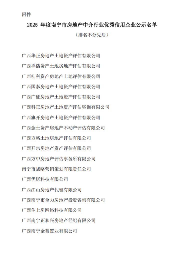 附件:2025 年度南宁市房地产中介行业优秀信用企业公示名单