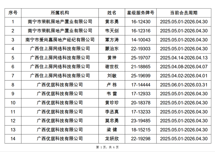 现有黄志勇【16-12430】等73人(详见附件名单)星级服务牌将于2026年4月30日到期,请及时绑定协会服务号nfzx5667533,点击“星级培训”页面进入到协会综合服务系统(NISS)平台进行学习完成续期。根据《南宁市房地产中介人员星级管理办法》,房地产中介人员星级服务牌到期未及时完成星级提升的,须重新申请星级的,原有星级不再累计。请各位会员相互提醒。
