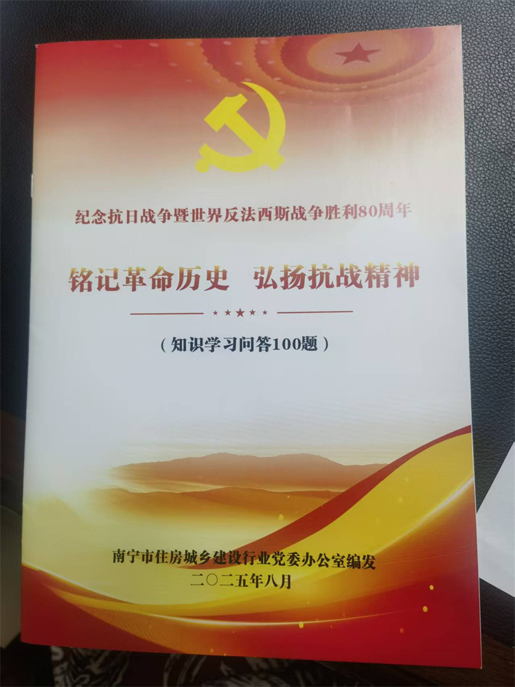 2025年是中国人民抗日战争暨世界反法西斯战争胜利80周年,为了隆重纪念抗日战争胜利日,8月28日上午,南宁市住房城乡建设行业党委在党员活动中心举办“铭记革命历史 弘扬抗战精神”主题知识竞赛活动,以竞赛为载体将抗日战争历史纳入党史学习教育重点内容,重温抗战峥嵘岁月,传承红色基因,歌颂党领导人民取得抗战胜利的伟大功绩。