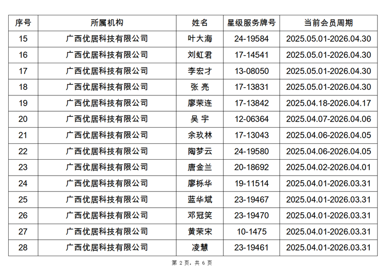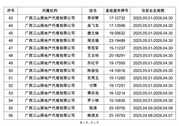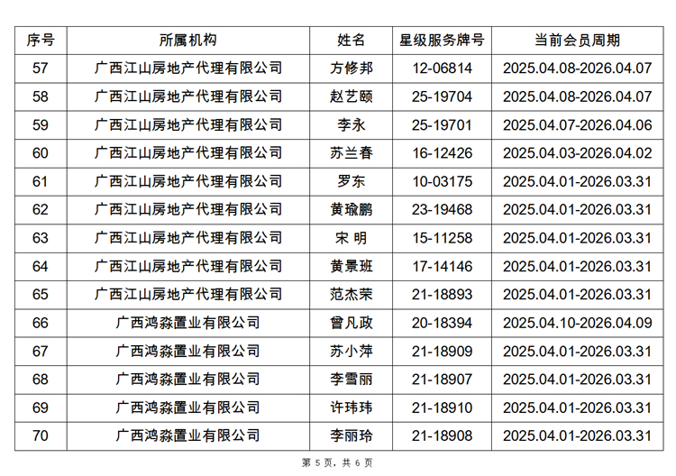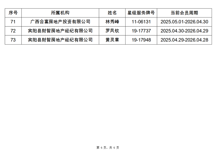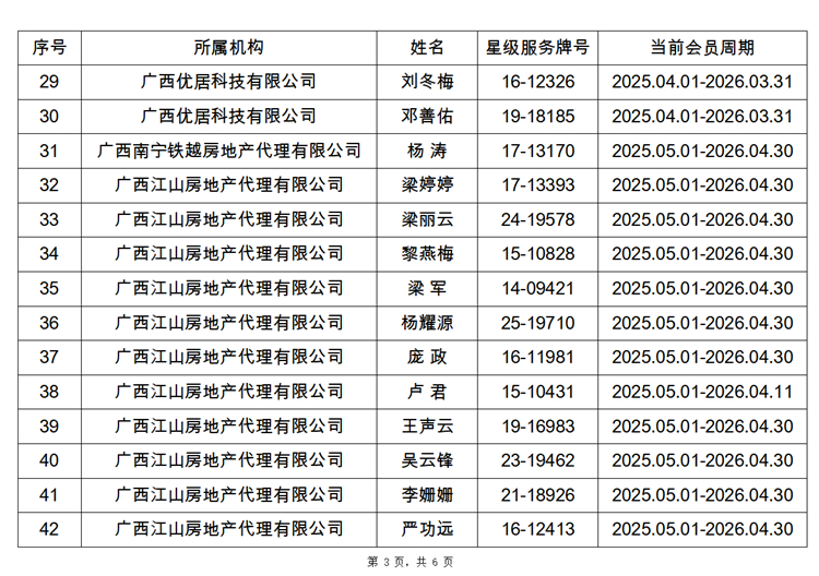 现有黄志勇【16-12430】等73人(详见附件名单)星级服务牌将于2026年4月30日到期,请及时绑定协会服务号nfzx5667533,点击“星级培训”页面进入到协会综合服务系统(NISS)平台进行学习完成续期。根据《南宁市房地产中介人员星级管理办法》,房地产中介人员星级服务牌到期未及时完成星级提升的,须重新申请星级的,原有星级不再累计。请各位会员相互提醒。